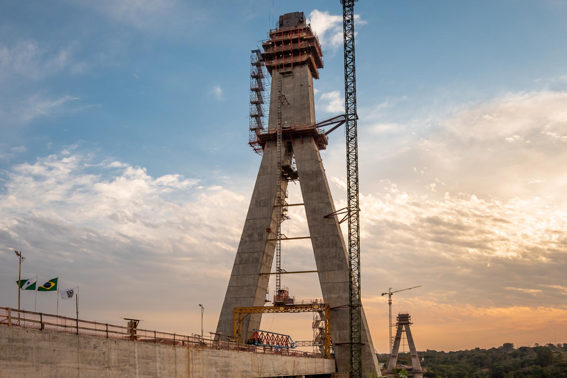 De acordo com o boletim, o consórcio responsável pelas obras concluiu em julho, no lado brasileiro, a concretagem da segunda laje de elevação do mastro, bem como o posicionamento da primeira camada das formas internas perdidas que compõem a terceira fase do mastro principal. Até o final deste mês, o mastro deve alcançar aproximadamente 93 metros de altura, do tabuleiro ao topo.